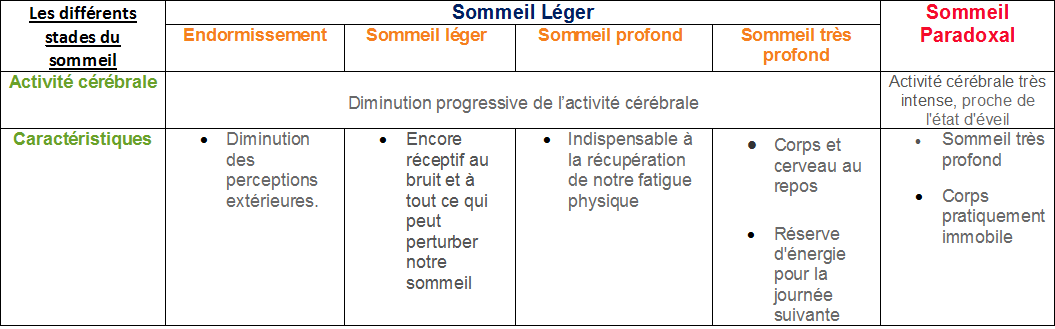Nous avons réalisé un tableau présentant les différents stades du sommeil: